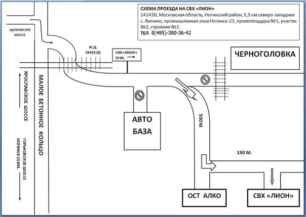 Проезд от Щёлковского автовокзала на автобусах №360, 320 до остановки “23-километр” и далее 500 м. до ворот ООО СВХ “ЛИОН”